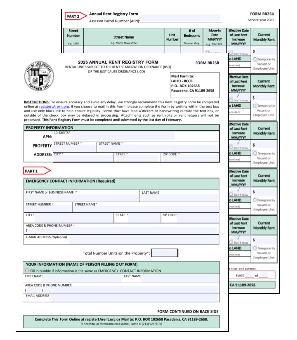 The annual Rent Stabilization Ordinance (RSO), Just Cause Ordinance (JCO), and Systematic Code Enforcement Program (SCEP) bill includes a two-page double-sided Rent Registry form. An online Rent Registry Portal has also been created at registerLArent.org to provide Landlords a more effective and efficient means to ensure accuracy and avoid any mailing delays. The Rent Registry Portal includes an online downloadable csv spreadsheet, which will be especially helpful for owners and managers of larger properties. This csv spreadsheet can be downloaded and, once information has been entered, the information entered on the spreadsheet will be uploaded automatically to the online rent registry portal. Landlords who pay their annual registration and submit their completed Rent Registry form online will receive their Annual Statement of Registration (Certificate) shortly after online submission.